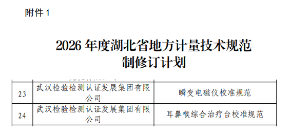 近日,湖北省市场监督管理局发布2026年度地方计量技术规范制修订计划,武汉检测集团成功入选主要起草单位,独立承担《瞬变电磁仪校准规范》《耳鼻喉综合治疗台校准规范》两项省级计量技术规范制定工作。此次入选既是政府部门对武汉检测集团计量技术实力、行业影响力的高度认可,更是武汉检测集团以技术标准赋能产业升级、守护社会民生的重要实践。